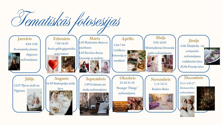 Katru sezonu un īpašajos svētkos radām jaunu, tematisku noformējumu, lai tavas fotogrāfijas būtu unikālas un atbilstošas noskaņai. Tā var būt maiga pavasara pasaka, košs vasaras sapnis, rudens siltuma pieskāriens vai ziemas brīnumu stāsts.